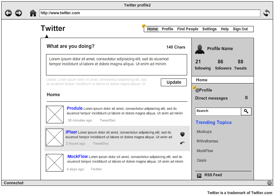 To make sure we understand what you need, we’ll create a mockup using the most advanced online mockup tool MockFlow. Below is a nice sample of a mockup we could do if a client wanted a Twitter clone. You can click on the picture to see the full size mockup with the options our clients have.